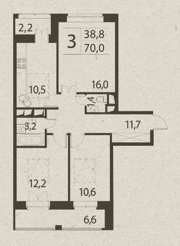 общая: 70 м2 | жилая: 38.8 м2 | кухня: 10.5 м2