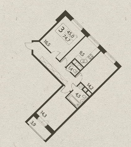 общая: 74.7 м2 | жилая: 45 м2 | кухня: 9.5 м2