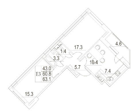общая: 63.1 м2 | жилая: 43 м2 | кухня: 7.4 м2
