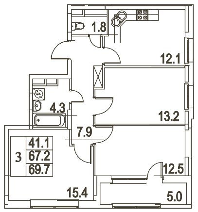 общая: 69.7 м2 | жилая: 41.1 м2 | кухня: 12.1 м2