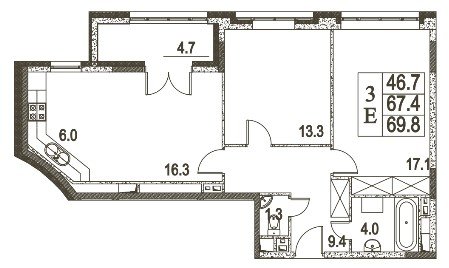 общая: 69.8 м2 | жилая: 46.7 м2 | кухня: 6 м2
