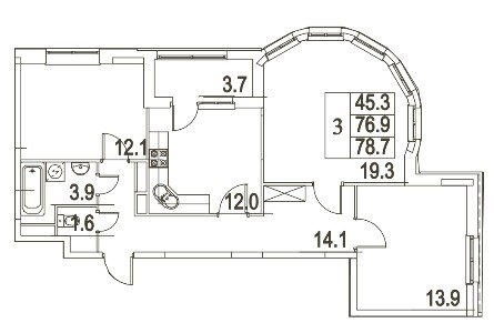 общая: 78.7 м2 | жилая: 45.3 м2 | кухня: 12 м2
