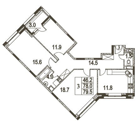 общая: 79.5 м2 | жилая: 46.2 м2 | кухня: 11.8 м2