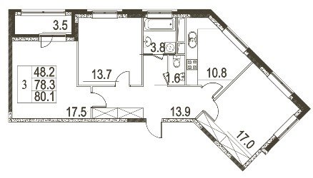 общая: 80.1 м2 | жилая: 48.2 м2 | кухня: 10.8 м2