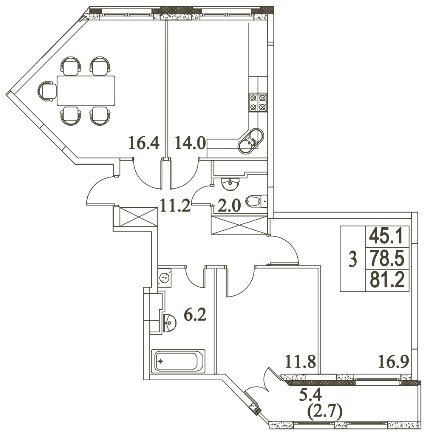 общая: 81.2 м2 | жилая: 45.1 м2 | кухня: 14 м2