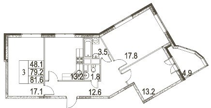 общая: 81.6 м2 | жилая: 48.1 м2 | кухня: 13.2 м2