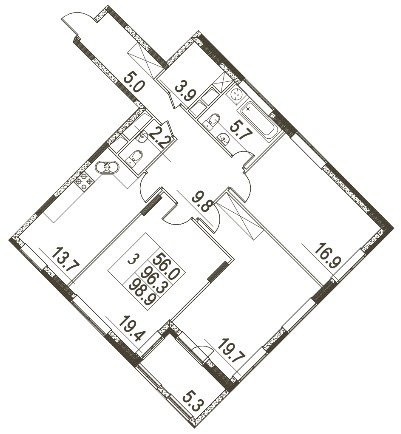 общая: 98.9 м2 | жилая: 56 м2 | кухня: 13.7 м2